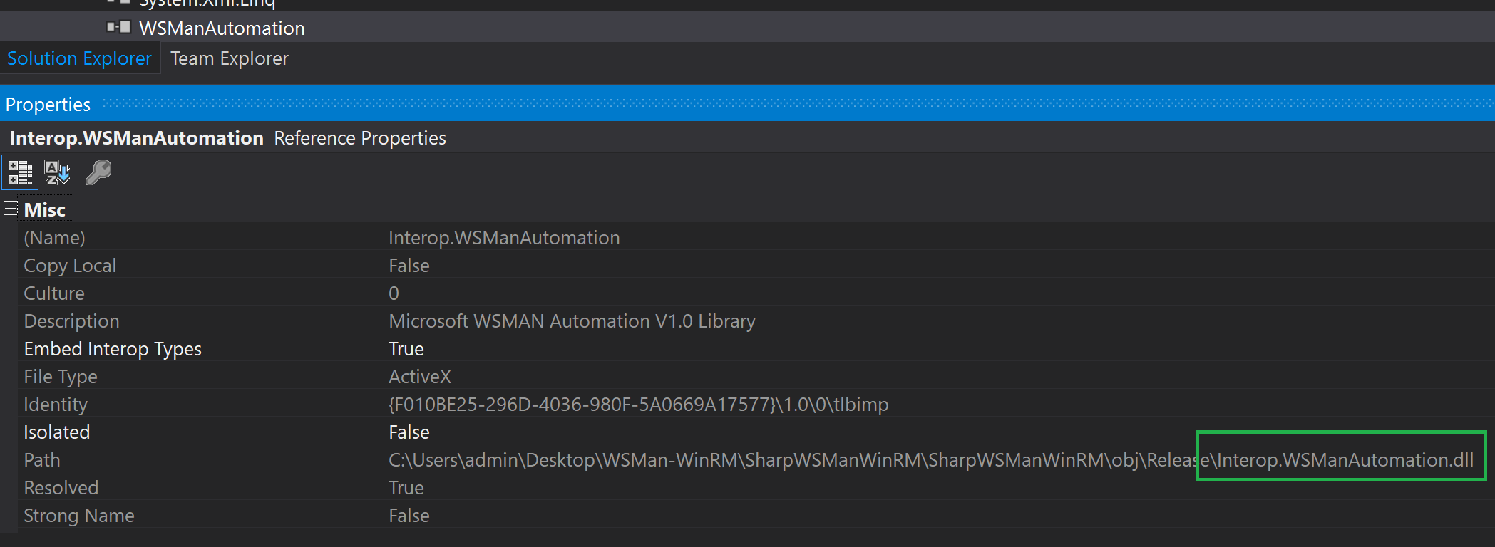 After the Reference is added, Visual Studio kindly generates the Interop.WSManAutomation.dll interop assembly and namespace for interacting with the WSMan Automation COM components as noted in the Reference properties: