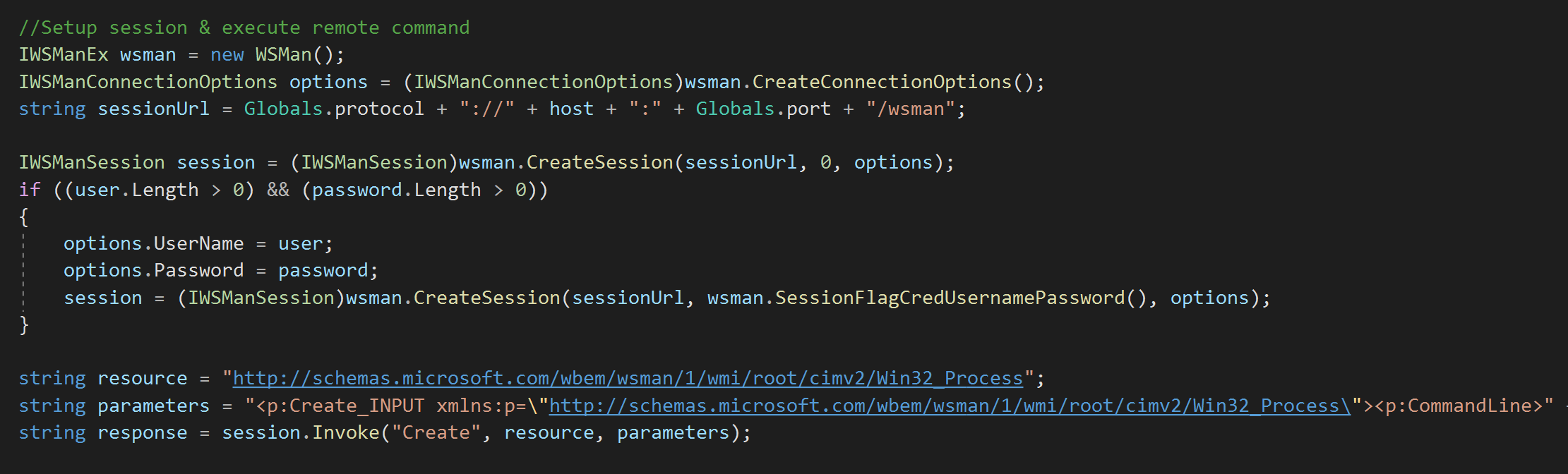 Note: Other flags can be set to specify authentication methods such as Negotiate or Kerberos. - The Invoke() method is called to invoke a WMI class action. In this case, the WMI Create method (action) is called to specify the creation of a remote process (from Win32_Process). resource is the retrieved WMI class identifier, and parameters contains the XML input, which includes the process/command to be executed.
