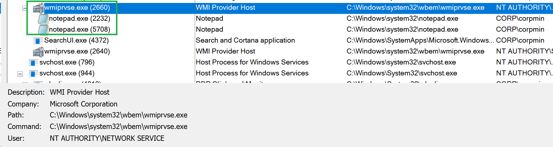 svchost.exe (DcomLaunch) -> wmiprvse.exe -> [remote command/binary]