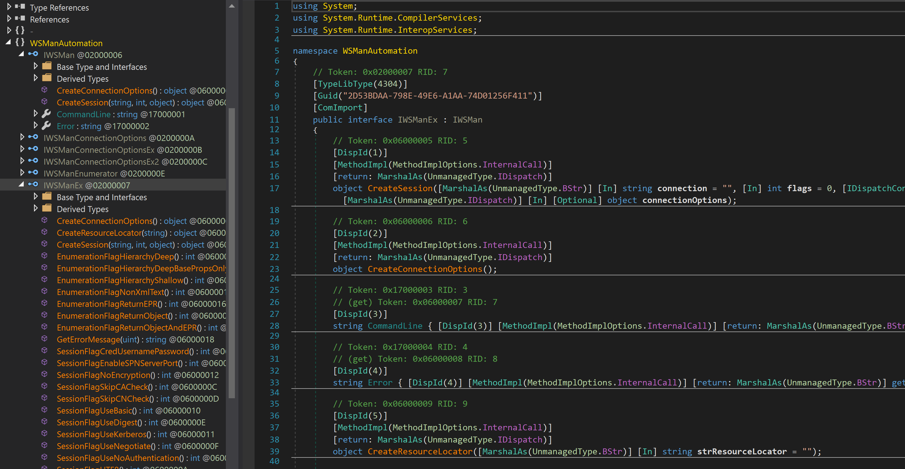 Before moving on, let’s take a quick peek into the Interop.WSManAutomation.dll that was auto-generated. Using dnSpy, we can ‘decompile’ the assembly to view the source code: